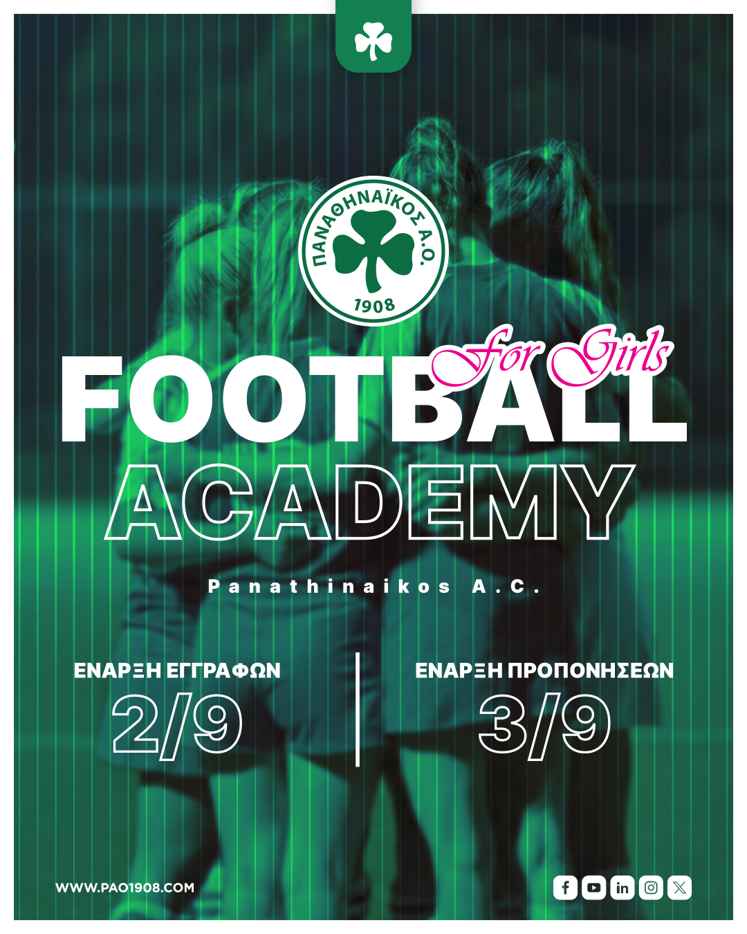 Την ευκαιρία να ενταχθούν στις τάξεις του μεγαλύτερου πολυαθλητικού συλλόγου της χώρας, του Παναθηναϊκού, στις ακαδημίες του ποδοσφαίρου γυναικών θα έχουν κορίτσια ηλικίας από 6 έως 17 ετών μιας και ξεκίνησαν οι εγγραφές για τη νέα σεζόν.