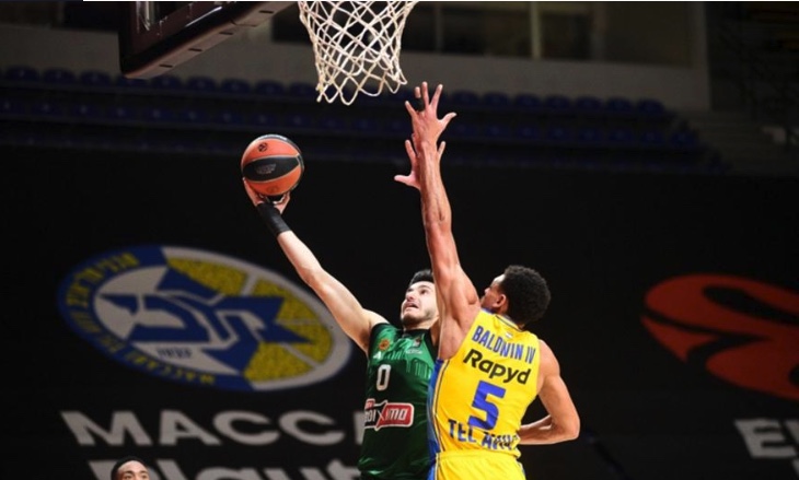 Το ματς ξεκίνησε με τρίποντα από αμφότερες τις ομάδες, δια χειρός Κοέν και Μήτογλου για το 3-3, με τον Ναν να βάζει βολές για το 3-5. Ο Παναθηναϊκός ήταν άστοχος στο ξεκίνημα παρά τις καλές του επιθέσεις, όμως βρήκε λύσεις με δύο βολές του Ναν για το 5-7. Ο Μπόλντγουιν απάντησε με τρίποντο για το προσπέρασμα της Μακάμπι (8-7), ενώ ο Κοέν έβαλε το δεύτερο προσωπικό του μακρινό σουτ για το 11-7. Ο Ναν μείωσε γρήγορα σε 11-9 από μέση απόσταση, ενώ ο Μπράουν έβαλε μία βολή για το 12-9. Ο Μήτογλου έβαλε τρίποντο και ισοφάρισε σε 12-12, ενώ Νίμπο και Λεσόρ σκόραραν από κοντά για το 16-14 της Μακάμπι. Ο Κόλσον έβαλε σουτάκι από μέση απόσταση, ενώ ο Γκραντ ισοφάρισε με μακρινό σουτ σε 18-18. Ο Αμερικανός έβαλε μπροστά τους πράσινους με μία βολή (18-19), ενώ ο Παπαπέτρου πέτυχε πολύ δύσκολο καλάθι για το 18-21 της πρώτης περιόδου.