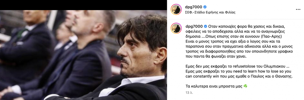 «Όταν κάποια/ κάποιες φορά θα χάσεις και δίκαια, οφείλεις να το αποδέχεσαι αλλά και να το αναγνωρίζεις δημόσια... Όπως επίσης όταν σε ευνοούν (ΠΑΟ - Άρης).