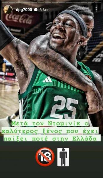 Ο Δημήτρης Γιαννακόπουλος ανάρτησε φωτογραφία του Κέντρικ Ναν σε story του στο Instagram, επισημαίνοντας ότι ο Αμερικανός γκαρντ είναι ο καλύτερος ξένος που έχει έρθει στην Ελλάδα μετά τον Ντομινίκ Ουίλκινς.