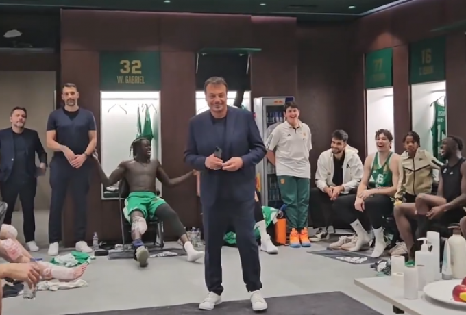 «Συγχαρητήρια. Κάνατε πολύ καλό παιχνίδι. Αυτό το παιχνίδι τελείωσε. Τώρα πρέπει αν σκεφτούμε για την επόμενη βδομάδα. Έχουμε το ντέρμπι στην Euroleague. Θα πάμε να κερδίσουμε εκεί. Πέρσι δεν κερδίσαμε εκεί στην Euroleague. Θα πάμε τώρα στον Πειραιά για να κερδίσουμε. Μια στιγμή… Αύριο (σ.σ. σήμερα) ο καιρός θα είναι υπέροχος. Θα είμαι στην παραλία. Έχετε ρεπό»!