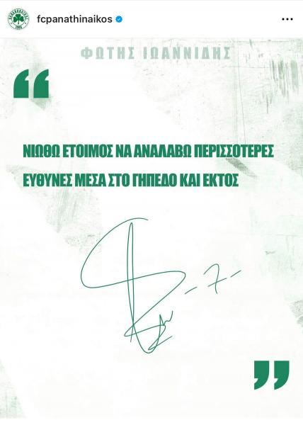 «Η ΠΑΕ Παναθηναϊκός ανακοινώνει την επέκταση συμβολαίου του Φώτη Ιωαννίδη. Ο Έλληνας επιθετικός υπέγραψε νέο συμβόλαιο, με το οποίο παραμένει στην ομάδα έως τον Ιούνιο του 2027.