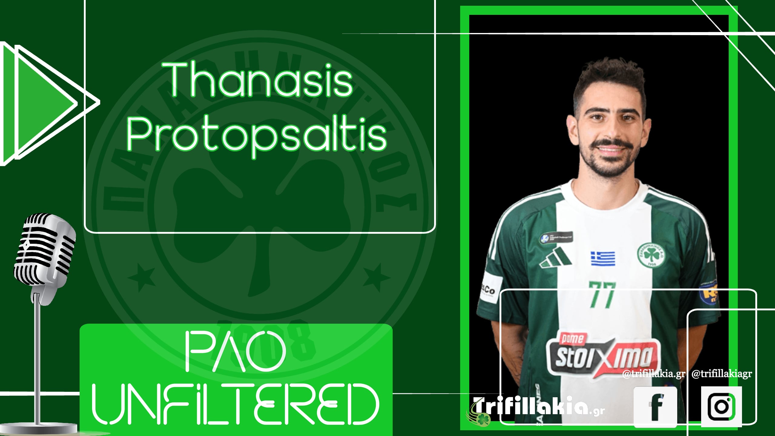 Ο Θανάσης Πρωτοψάλτης έρχεται στο 8ο επεισόδιο του PAO Unfiltered καλεσμένος των Χρήστου Γεωργίου & Σοφίας Τζιούβελη. Λίγες ημέρες μετά τη μεγάλη νίκη επί του Ολυμπιακού μιλάει για τα πάντα. Από τον σχεδιασμό της φετινής ομάδας, τους στόχους προσωπικούς και της ομάδας αλλά και το μήνυμα προς τον κόσμο και τα νέα παιδιά.
